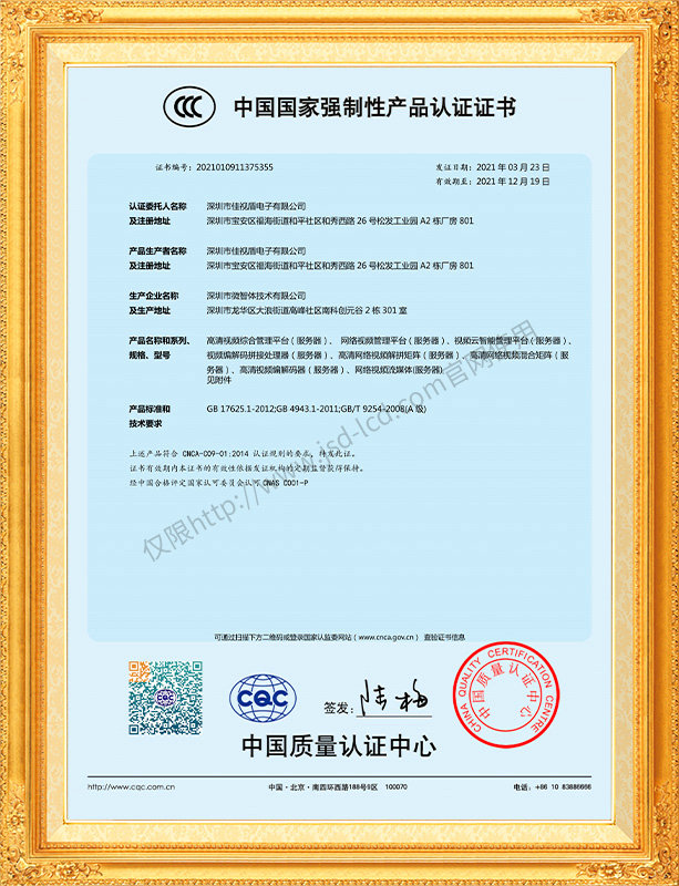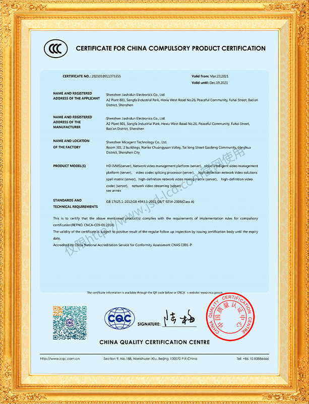 佳視盾科技采用了科學(xué)現(xiàn)代化管理模式,公司和產(chǎn)品通過了CCC、CB、CE、FCC、ROHS、ISO9001、職業(yè)健康管理體系、環(huán)境管理體系,中國節(jié)能認(rèn)證、多項(xiàng)認(rèn)證,取得多項(xiàng)專利技術(shù)及多項(xiàng)軟件著作權(quán), 并獲得國家及行業(yè)協(xié)會的多項(xiàng)榮譽(yù)證書,所有產(chǎn)品均經(jīng)過嚴(yán)格老化檢測及測試,達(dá)到行業(yè)優(yōu)等品的出貨標(biāo)準(zhǔn)。